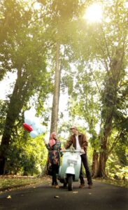 Bayangkan berjalan berdampingan di trotoar bergaya vintage dengan latar pepohonan rindang — sederhana, tapi penuh karakter.
